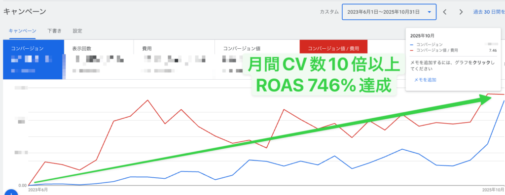 CV(購入数)は、ご依頼前の自社運用時と比較して単月ベースで10倍以上に増加しました。成果が出たことで広告予算も当初の10倍以上に増額いただきましたが、CPA(購入獲得単価)は悪化していません。2025年10月時点では、ROAS(広告費に対する売上比率)746%を達成しています。