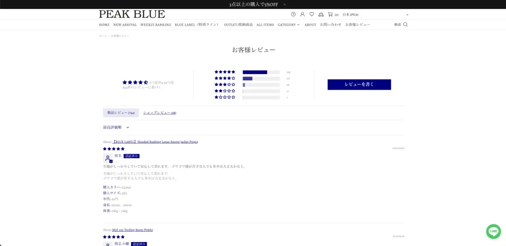 株式会社RECOBASE様は、アメカジ専門のアパレルECショップ 「PEAK BLUE(ピークブルー)」を運営されています。レビュー数は800件を超え、評価は星4.5以上。2026年1月時点では「アメカジ」のGoogle検索でもSEO1位に表示される実力派の人気ショップです。